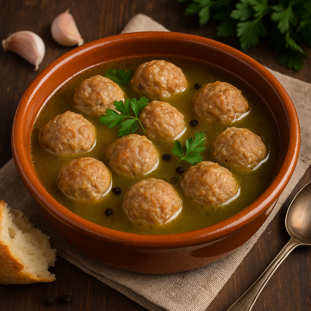 Albóndigas tiernas de cerdo y pollo con jamón, cocidas en un sabroso caldo casero con ajo, hueso y especias.